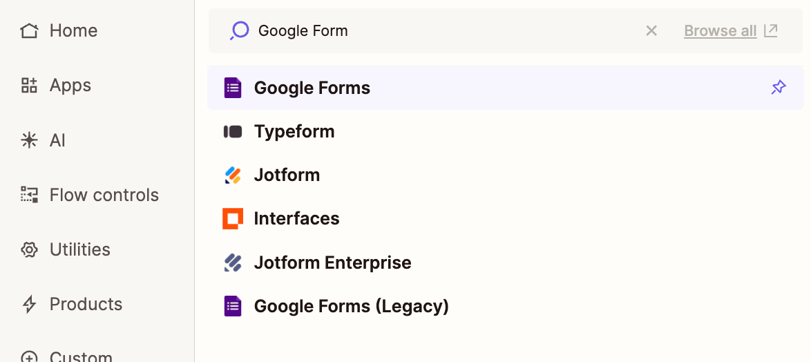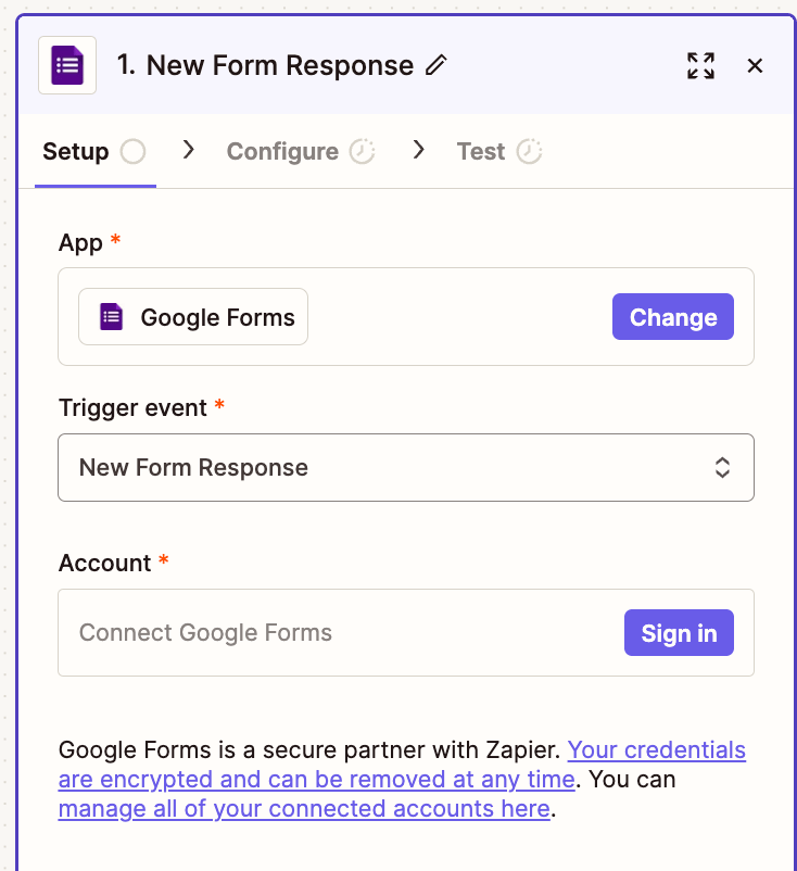 Choose trigger and pick your form submission tool (in this case, Google Forms) and choose New Form Response. You’ll need to connect your account to Zapier, which lets it sync to whatever form you want! Just click “Sign in”.