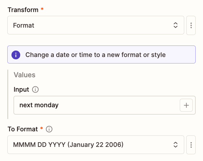 Then in the To Format field, choose MMMM DD YYYY so it just gives you the date.